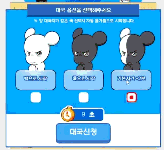 대국 옵션(흑,백)을 선택 후 대국 신청을 눌러주세요.※ 양대국자가 같은 돌을 선택했을 시는 자동으로 돌가림 됩니다.